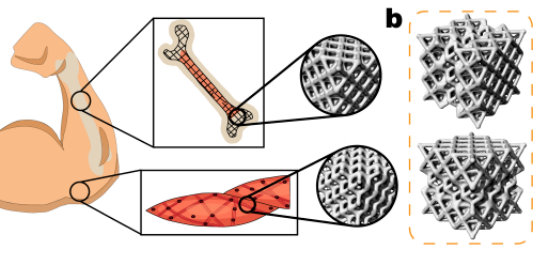 中國科學院福建物質結構研究所面向輕量化3D打印結構在鞋業和汽車等領域的應用開展研究。受自然界生物結構兼具剛度和柔韌性的特征啟發,科研人員通過分級彎曲和拉伸主導的結構來設計混合架構的晶格。進一步,該工作使用純樹脂及高二氧化硅固含的復合材料,采用3D打印方式制備了以上晶格結構,并將結果與理論分析數據進行比較以驗證設計合理性。